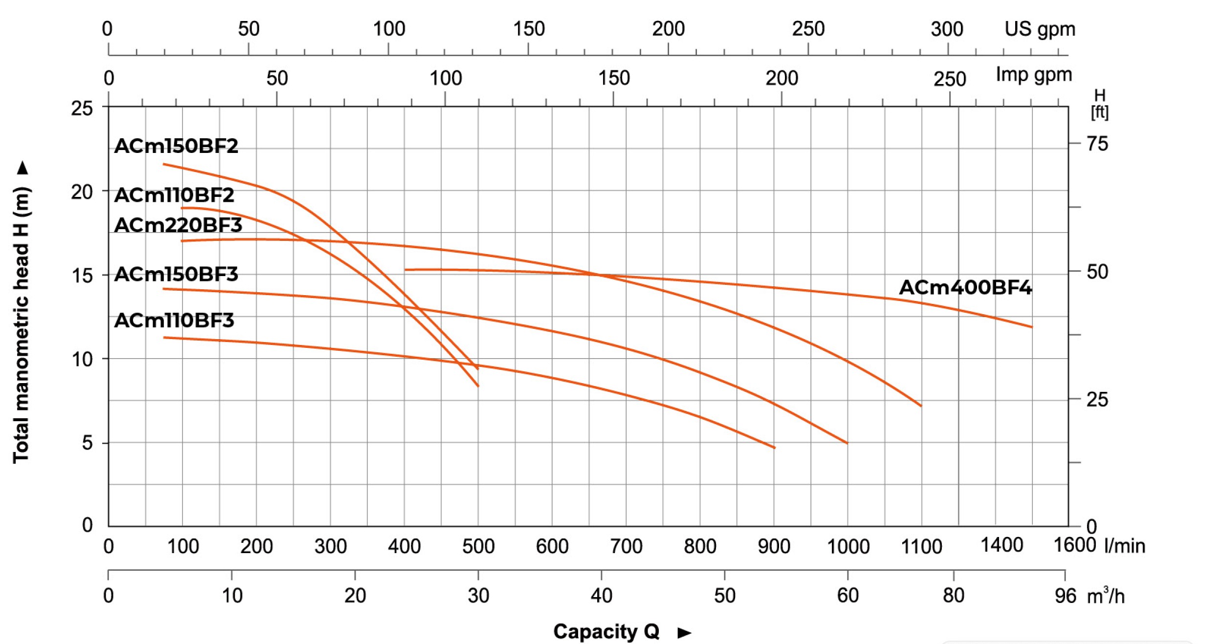 Ниже представлен график производительности для моделей AC(m) F с отображением зависимости между подачей (л/мин) и напором (м):